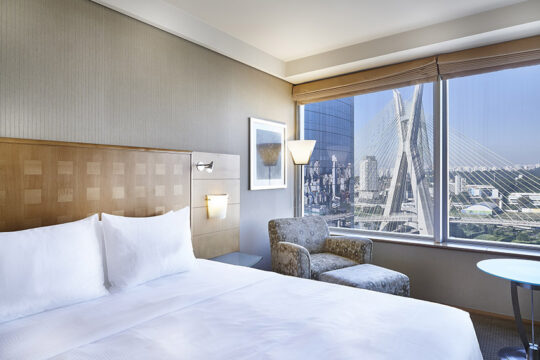Hotel cinco estrelas está localizado de frente a Ponte Estaiada.