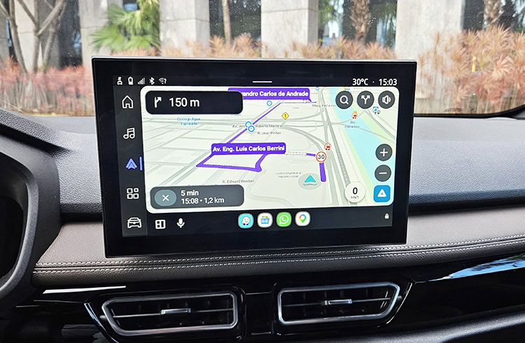 O sistema permite espelhamento sem fio via Apple CarPlay e Android Auto, comandos por voz e conexão simultânea de dois dispositivos via Bluetooth.